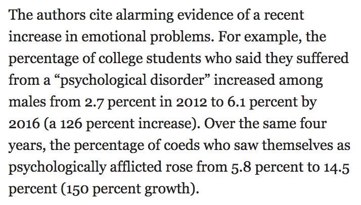 Outros culpam a própria degeneração social e sexual do Ocidente: o fim da religião e de qualquer tipo de moralidade (todo tipo de sexualidade e comportamento é aceito) aumentou o número de problemas psicológicos. As pessoas, eles dizem, precisam de limites. Na total liberdade de desejo, muitos descobrem que não é aquilo que os leva a qualquer tipo de felicidade ou sequer serenidade. O mesmo acontece com o feminismo, que gerou o paradoxo de mulheres mais infelizes do que antes, e para combater mais essa infelicidade, se jogam mais ainda no feminismo, e assim ad infinitum.